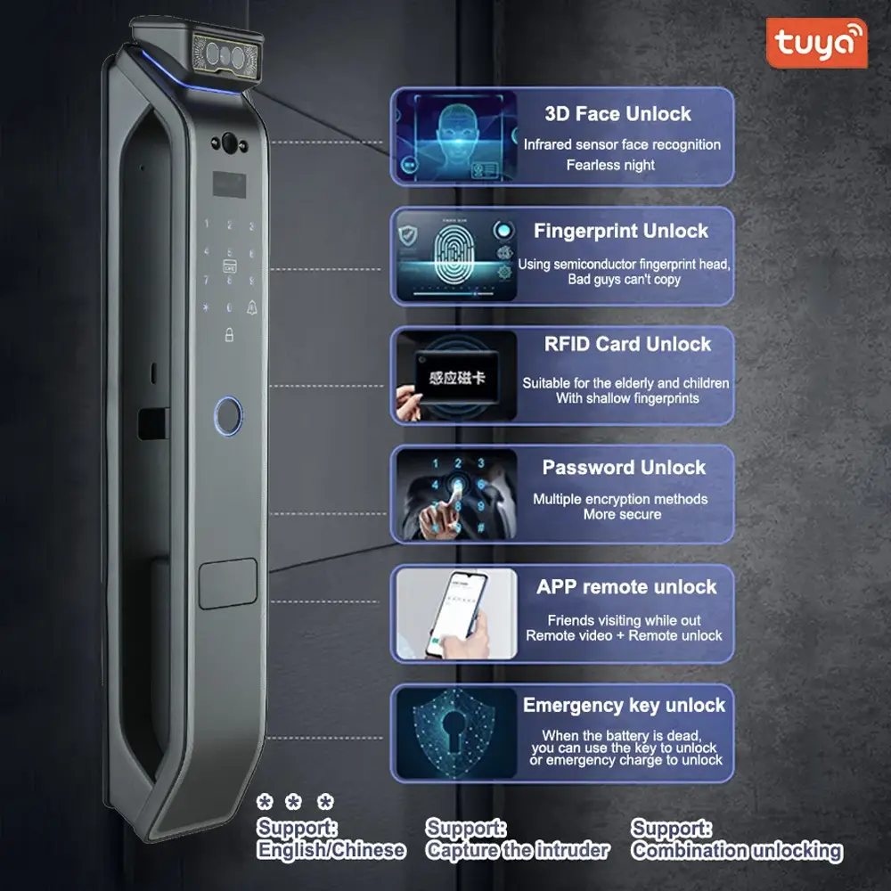 Métodos de desbloqueo: Reconocimiento facial 3D, aplicación Tuya wifi, contraseña, huella dactilar, tarjeta y llave física.