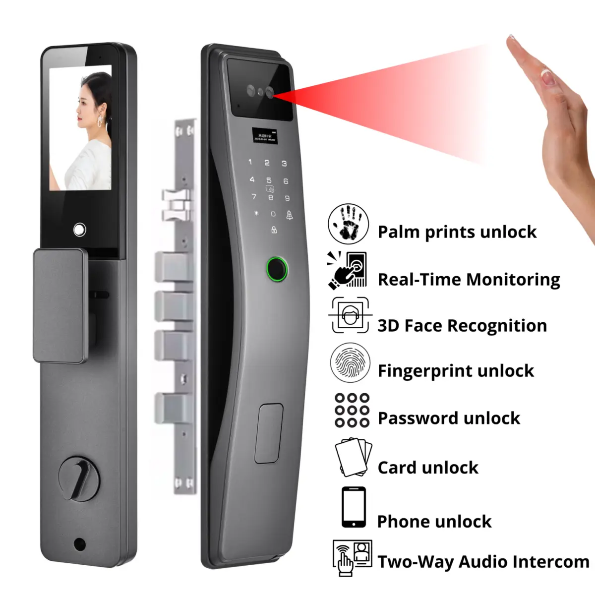 Dígale adiós a las llaves y los códigos: nuestra cerradura inteligente 3D con huella dactilar y de palma combina tecnología biométrica de vanguardia con seguridad de nivel militar para brindar comodidad y protección inigualables.