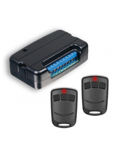 El Kit está compuesto por un receptor de 3 Canales y dos salidas programables por relay, incluye dos controles remotos modelo TX-200. Permite incorporar hasta 60 controles TX-200