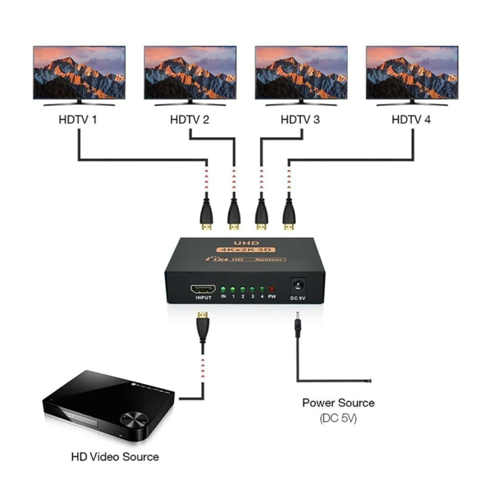 - Soporta una sola fuente de señal HDMI, con acceso a multiple salida HDMI, la fuente puede ser un reproductor DVD, un receptor A/V, consola de videojuegos, pc o notebook, DVR, etc...